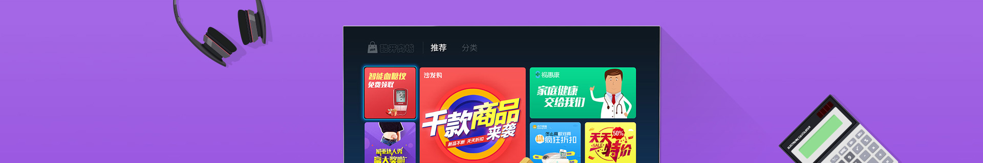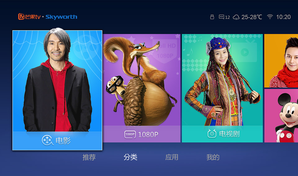视频内容的分类入口,通过UI设计区分主次,将重要类别如电影、电视剧等摆放重要位置,并大图标显示,可以快速进入对应视频内容列表;在UI形态上还使用了动态效果,让界面更清新活泼!