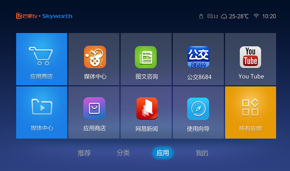 应用的安装是电视智能化的一个重要功能,SKY-UI内置应用商店有上千款适配于TV版本的高品质应用,每款应用都经过真机人工审核和检测,确保安全高效。您还可以在电脑下载后通过U盘安装,已安装的应用将会大方块显示于界面面。